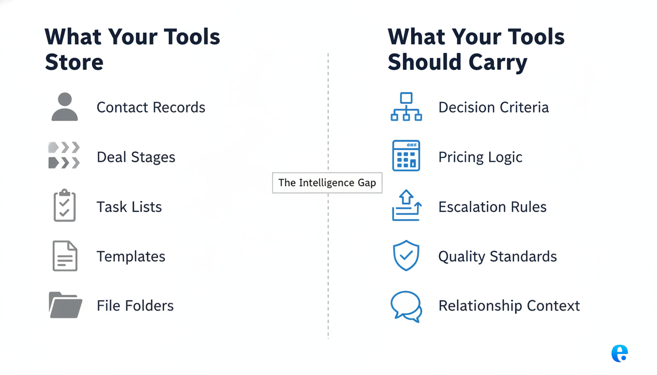 The gap between what your tools store and the intelligence they should carry is where Decision Cost lives. Every time your team opens the CRM and still needs to ask you what to do, the business is paying for that gap.