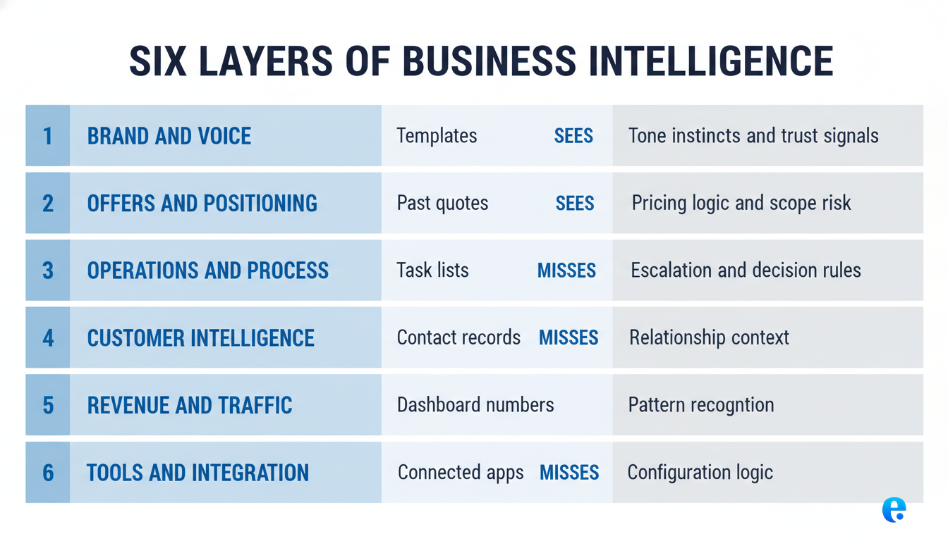 Every founder led service business runs on six layers of intelligence. Your tools touch the surface of each one, but they rarely carry the depth.